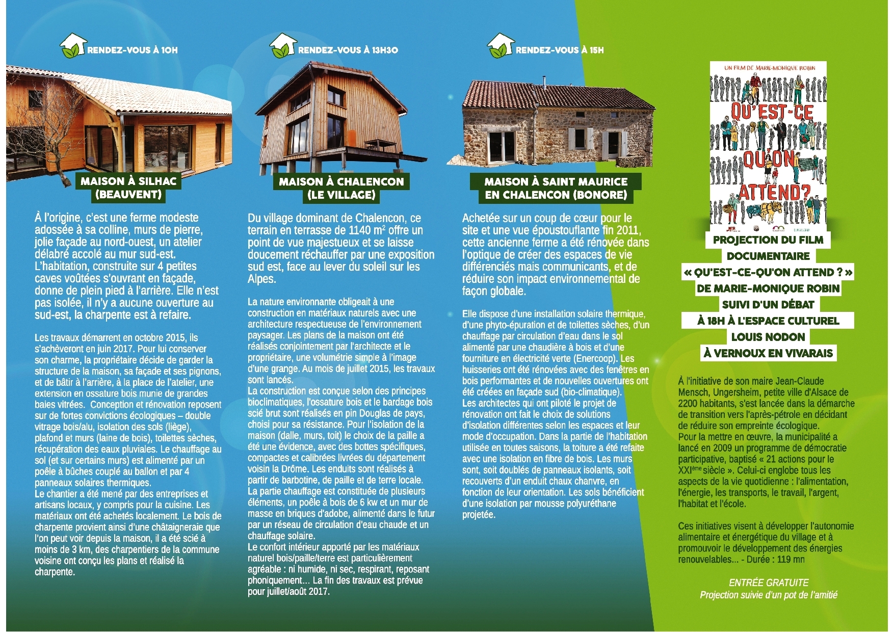 Pour cette 3ème édition, ce sont 3 maisons exemplaires, construites et rénovées avec des éco-matériaux qui sont à découvrir à Silhac, Chalencon et Saint-Maurice-en-Chalencon.